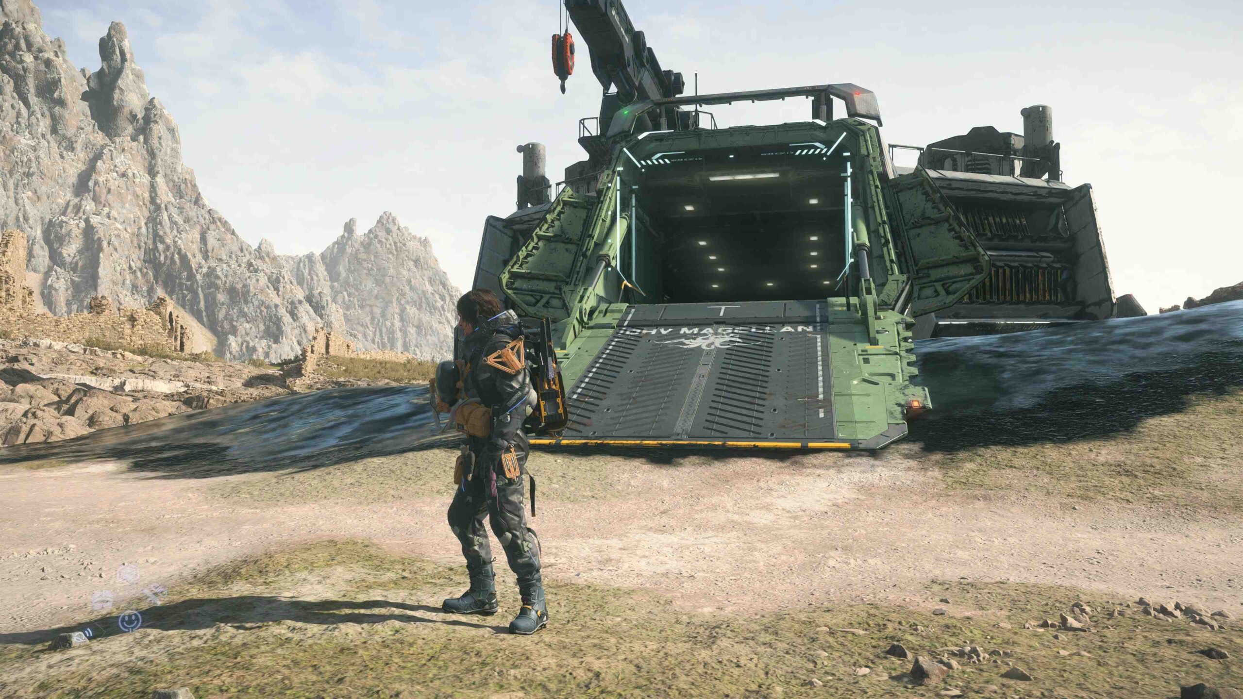 Während Sam die wenigen Stationen im relativ überschaubaren Gebiet von Mexiko verbindet, landet irgendwann dieses prächtige Schiff von Drawbridge in der Wüste und dient als Stützpunkt sowie universelles Transportmittel. Das fliegt nicht etwa nur wie ein Flugzeug, sondern kann wie ein U-Boot durch die seit Death Stranding auftauchenden Teerströme von Ort zu Ort tauchen. Sie werden im Laufe des Spiels wie ein übernatürliches Meer behandelt. Wenn die Magellan landet, hat sie manchmal einen riesigen schwarzen See unter sich. Bei Nacht sieht sie mit ihren Positionslichtern einfach nur klasse aus und wenn man sich nähert, scheint sie einen zu begrüßen.