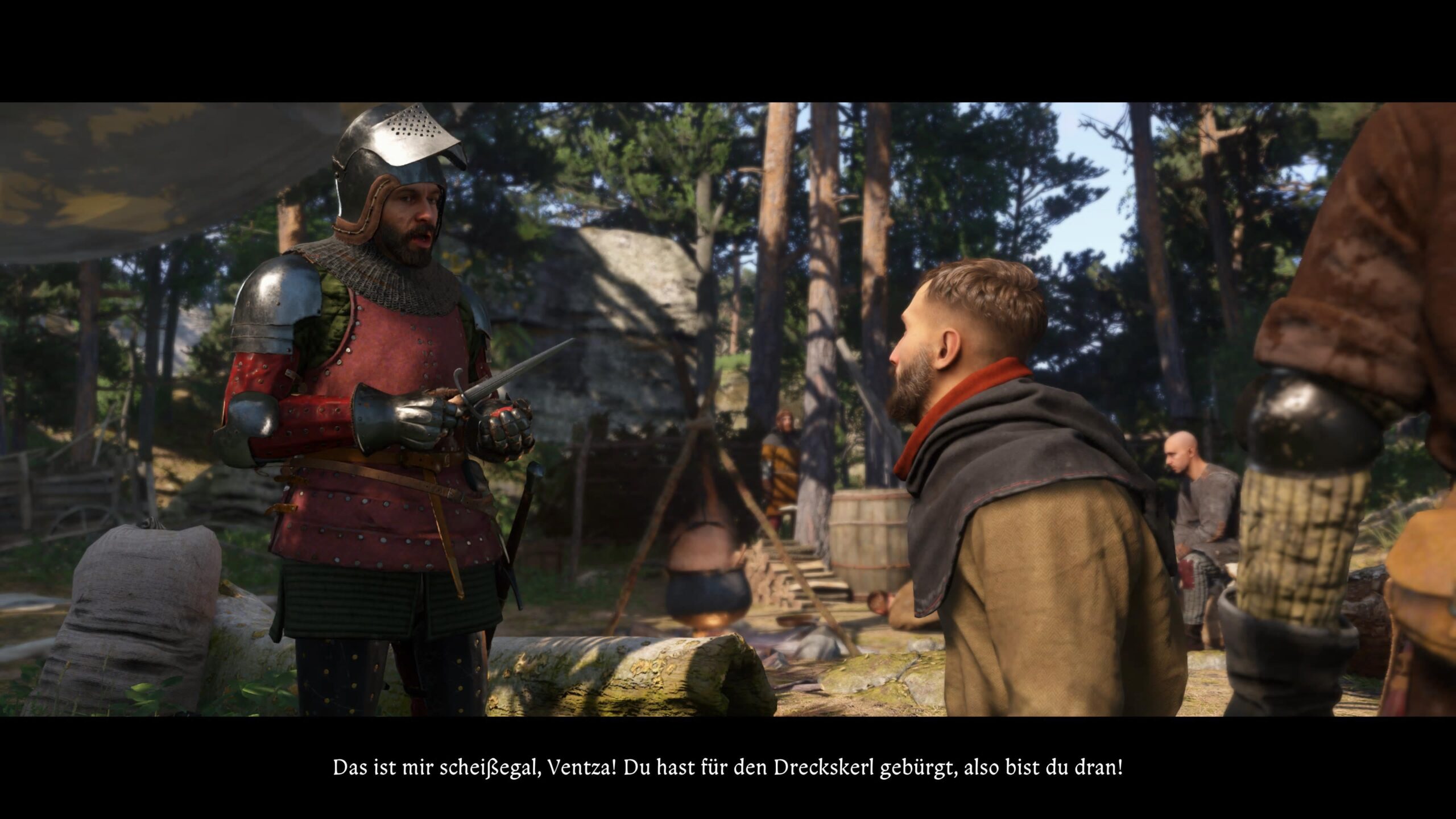 Also campiert der ständig empörte, oft nervig arrogante Hans Capon von Pirchstein an einem See in der Nähe und fordert Heinrich zu einem Übungskampf. Obwohl man offiziell dessen Leibwächter ist, wird man hier den erwähnten Anspruch bemerken und vielleicht verlieren. Und wer sich denkt, dass er ohne Kampftraining auskommt, wird sich bald wundern, denn das ist kein Rollenspiel, das man diplomatisch oder rhetorisch spezialisiert meistern kann.