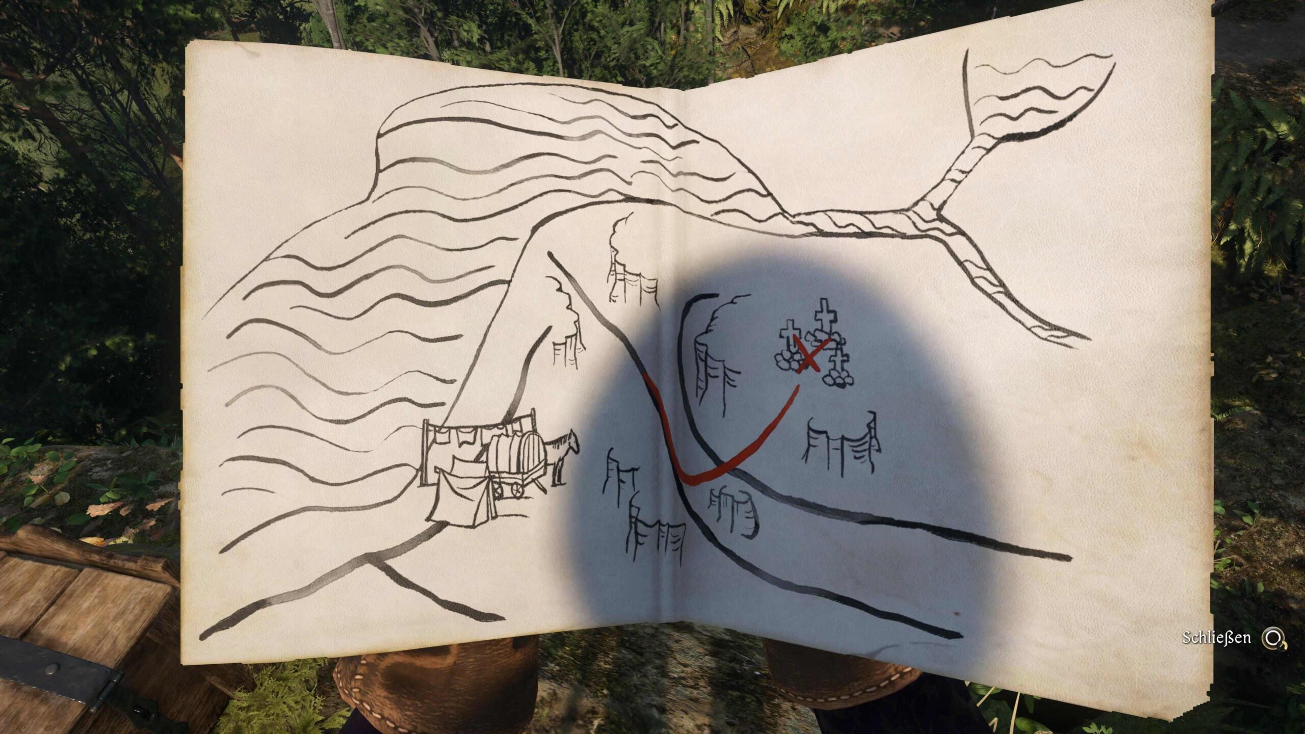 Man bekommt nicht nur immer mehr Aufträge, sondern findet Schatzkarten, die einen markierten Ort im Gelände zeigen, oder kryptische Reime mit einem Hinweis, und kann irgendwo in der Wildnis vielleicht unverhofft Beute machen. Einmal hab ich einen von einem Bolzen durchschossenen Apfel in einem Baum gefunden – und recht wertvolle Bolzen drumherum. Zwar verzichtet Kingdom Come auf Magie & Co, aber man kann mit einer Vielzahl an Tränken nahezu alle Fähigkeiten verstärken und sogar Nachtsicht aktivieren. Außerdem gibt es Aberglauben, Spukgeschichten und Legenden von Wassertrollen, denen man nachspüren kann. Ähnlich wie in Red Dead Redemption 2 scheinen die Grenzen zwischen Realität und Folklore dann manchmal in der Landschaft zu verschwimmen, wenn man an einem sumpfigen Ufer plötzlich eine seltsame Hütte mit Knochen und Artefakten findet.