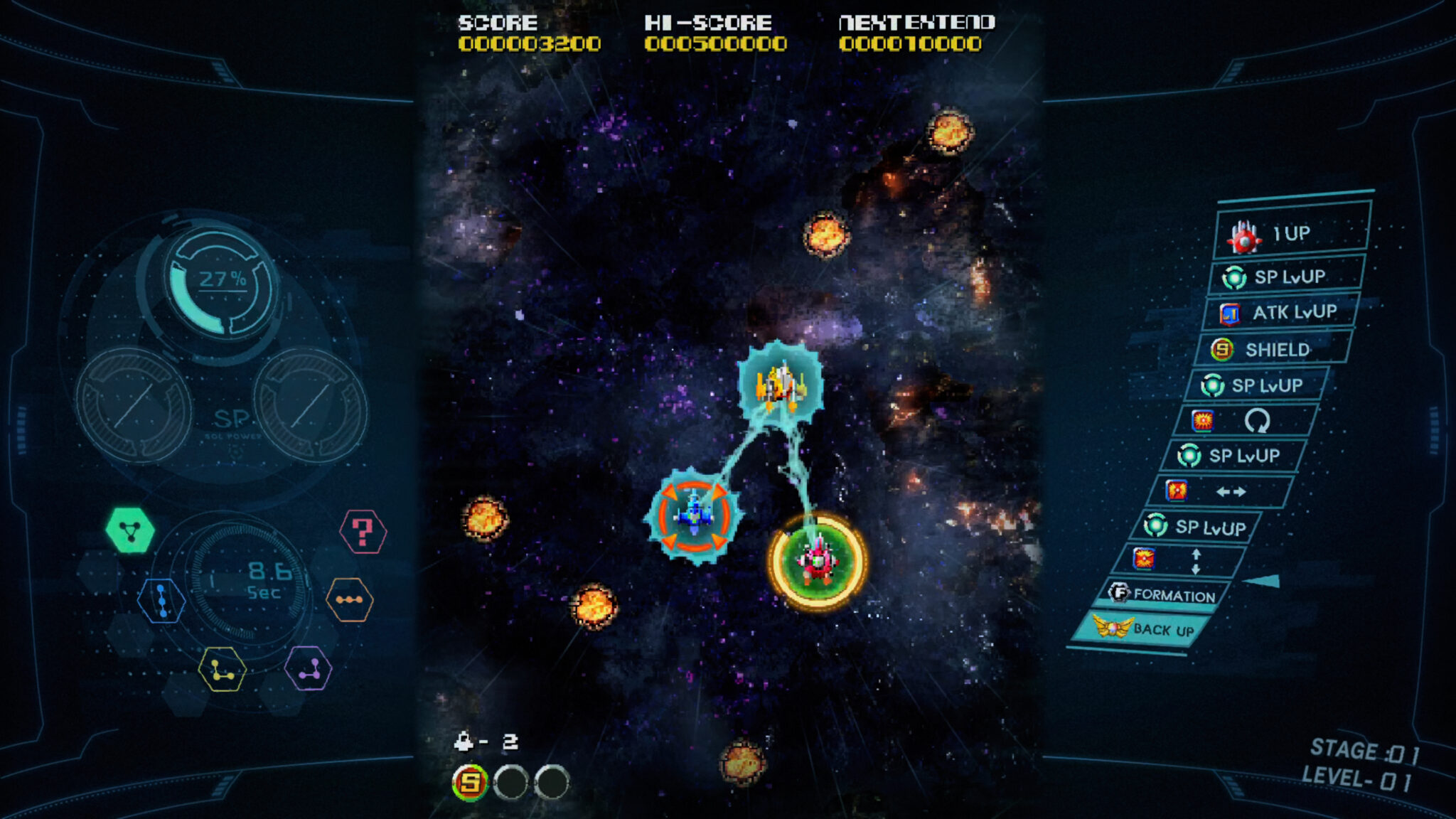 Für PlatinumGames soll dieses Spiel übrigens der Auftakt für eine Reihe namens “Neo-Classic Arcade” sein, in der man den Geist der Pionierzeit noch öfter in modernem Gewand präsentieren will. (Bild oben: Moon Cresta, PSN; Bild unten: Sol Cresta, PlatinumGames)