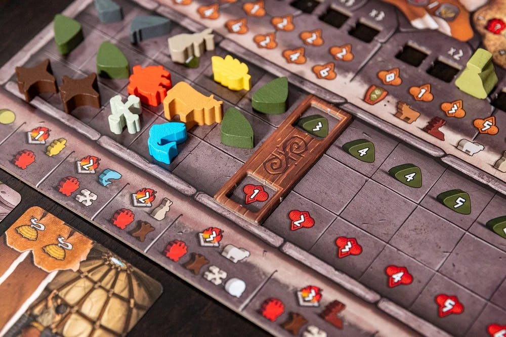 Links daneben sieht man das Tableau mit seinem Haushalt, auf dem man Rohstoffe lagert, managt und seine Siedlung entwickelt. Hier ist das Besondere der olivgrüne Abfall namens Midden: Denn je mehr man herstellt, desto voller wird das Lager nicht nur mit mehr Knochen, sondern auch Müll, der Platz wegnimmt und Minuspunkte bringt. Das wird anschaulich symbolisiert durch einen Marker, der von links nach rechts verschoben wird.