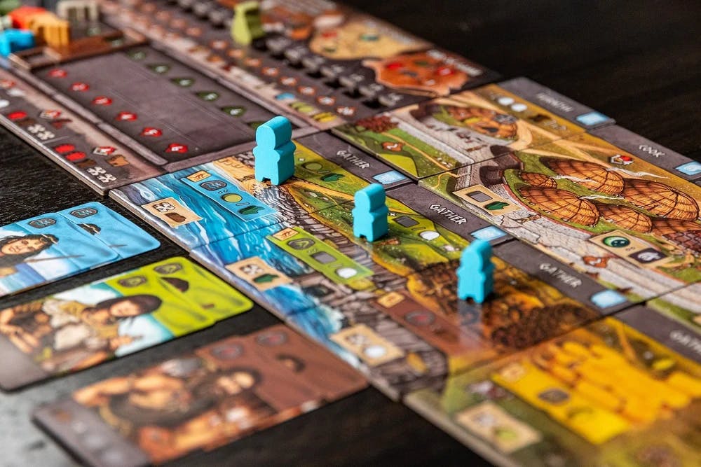 Man übernimmt die Führung eines kleinen Stammes aus Jägern und Sammlern, der über vier Runden mit den anderen darum wetteifert, so erfolgreich wie möglich alle Bewohner zu ernähren und die Siedlung zu entwickeln. Es geht zwar um klassisches Workerplacement, aber das clevere Management von Rohstoffen steht im Mittelpunkt. Das ist allerdings kein Spiel für Freunde der Kommunikation oder Interaktion, denn es gibt weder Kämpfe noch irgendeinen Tausch untereinander, so dass jeder alleine für sich agiert.